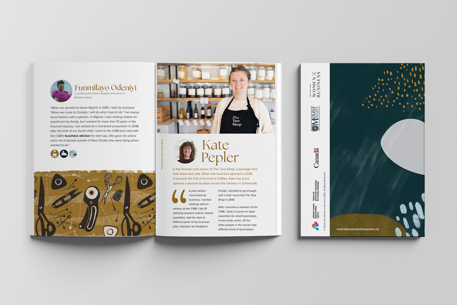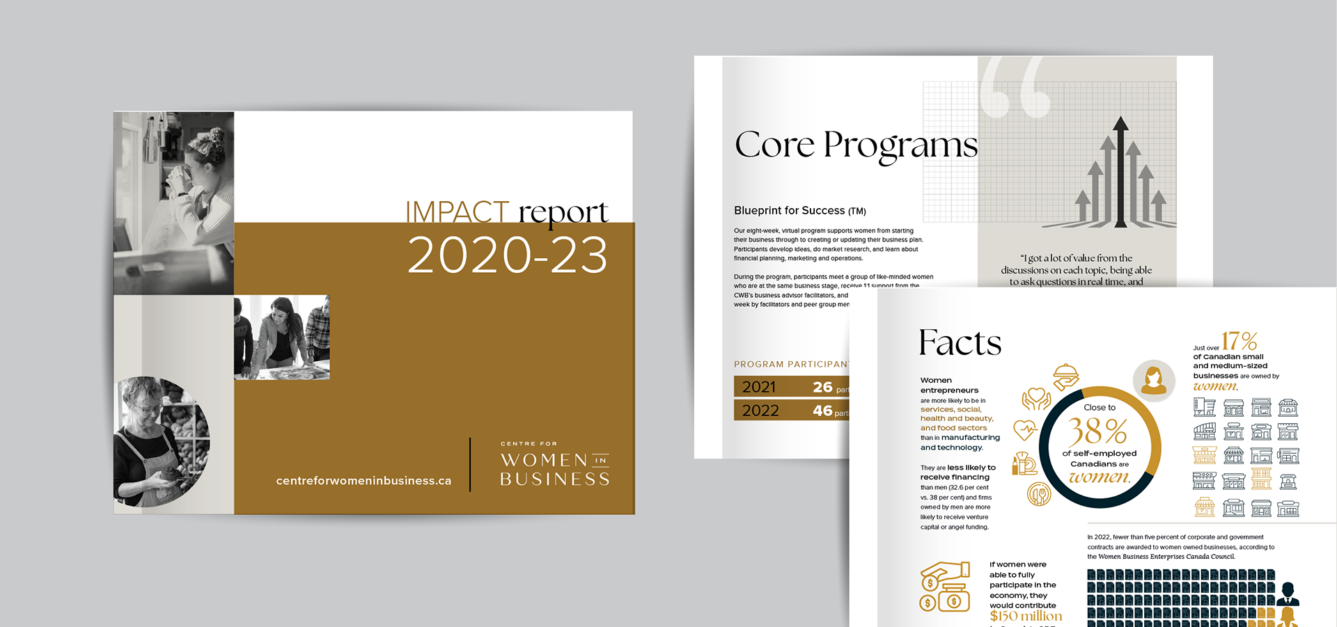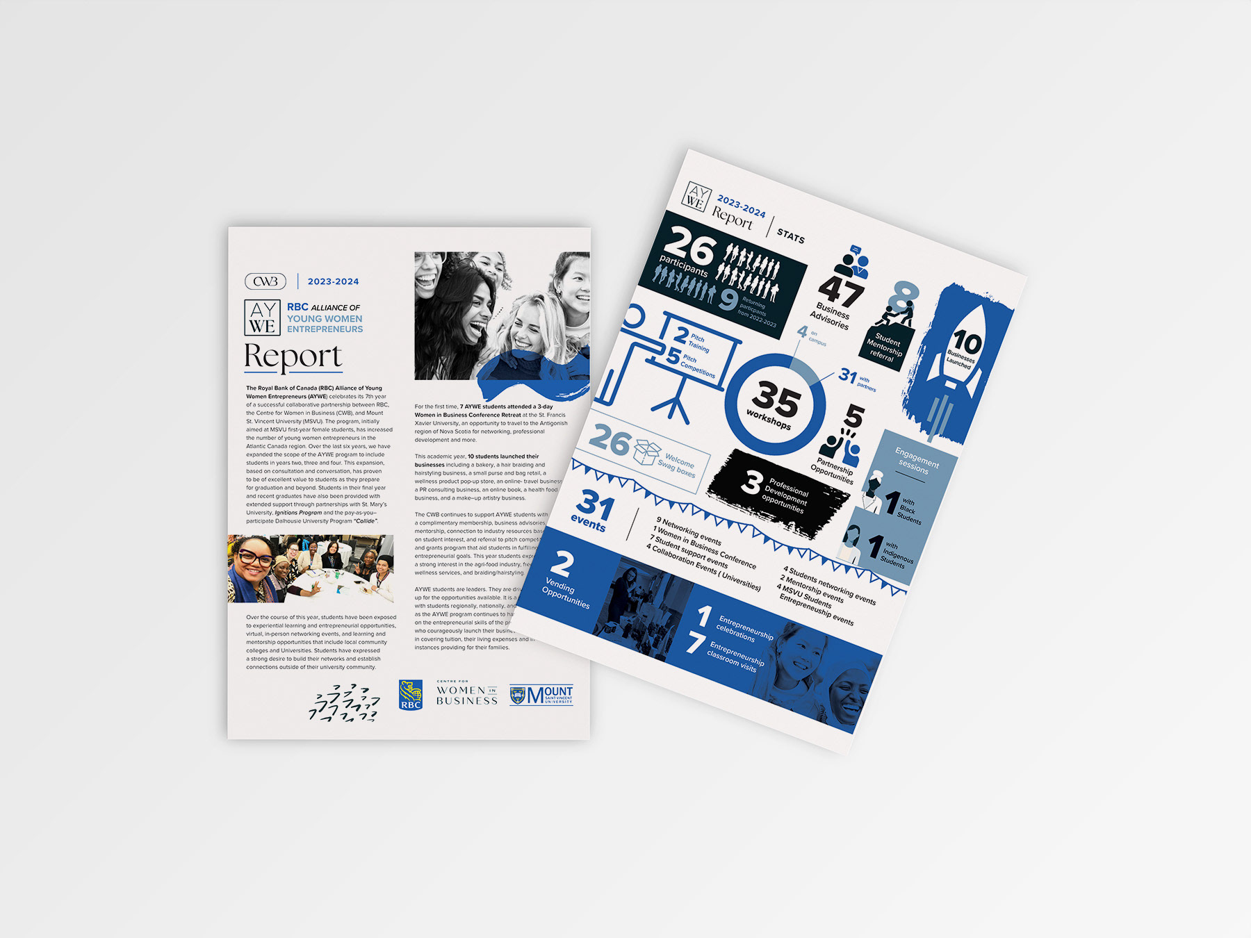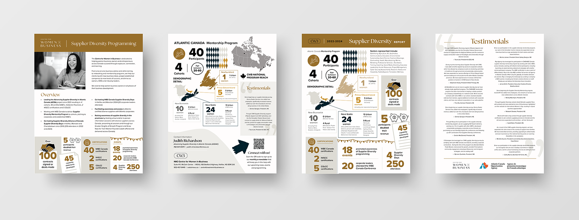 I have worked on a multitude of amazing projects with the CWB, including the CWB Way book; a 44-page, full colour book which was developed to celebrate the successes of the CWB over the last 30 years. I design their annual reports, presentation templates, program and event materials in both digital and print mediums. I have also developed branding for their programming and even created short infomational videos that promote the program offerings.